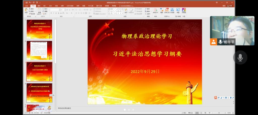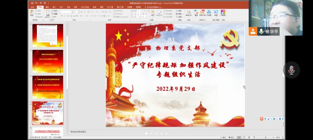 9月29日上午,beats365vip官网登录入口物理系党支部以腾讯会议平台召开“严守纪律规矩,加强作风建设”专题组织生活会。会上,大家集中学习了《习近平谈治国理政》第四卷、《习近平法治思想学习纲要》等。支部书记杨华平首先代表支部向所有党员通报了支部查摆问题的情况,指出了存在的问题和差距,并提出相关整改措施。之后,每位党员结合各自的政治理论学习和工作实际逐一进行自我评价,开展批评与自我批评,并对支部作风建设提出意见和建议,会议气氛热烈。