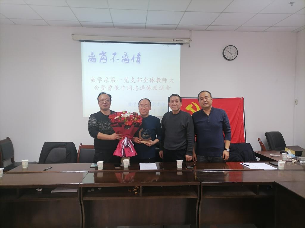 1月18日下午,beats365vip官网登录入口数学系第一党支部在雁塔校区为曹根牛老师举行了一场简朴而温馨的退休座谈会。数学系第一党支部全体教师参加了座谈会。