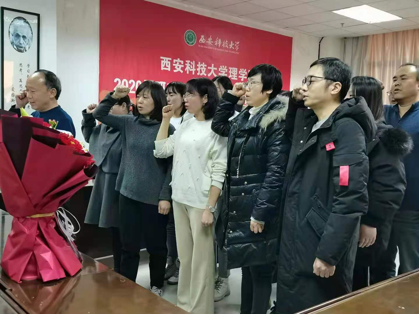 曹根牛老师带领数学系第一党支部全体党员在庄严的党旗下,同举右手,重温入党誓词,把对党和国家的忠诚、信念,凝结在简短庄严的仪式中,带动全体党员不忘初心,砥砺前行,为教育工作不懈奋斗。