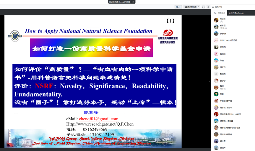 会上,陈其峰教授结合自己在国家自然科学基金申报过程中的经历和经验,作了“如何打造一份高质量科学基金申请书”的精彩报告。陈教授从如何打造一份有血有肉的高质量科学申请书入手,通过物理类案例讲解了如何提出问题、解决问题、凝练科学问题等一系列重要环节。报告深入浅出,对教师们在现阶段如何选定科学问题属性和申请代码等关键细节带来了很大启发。报告结束后,beats365vip官网登录入口部分老师汇报了基金的进展情况,陈其峰教授就具体问题提出了建设性指导。
