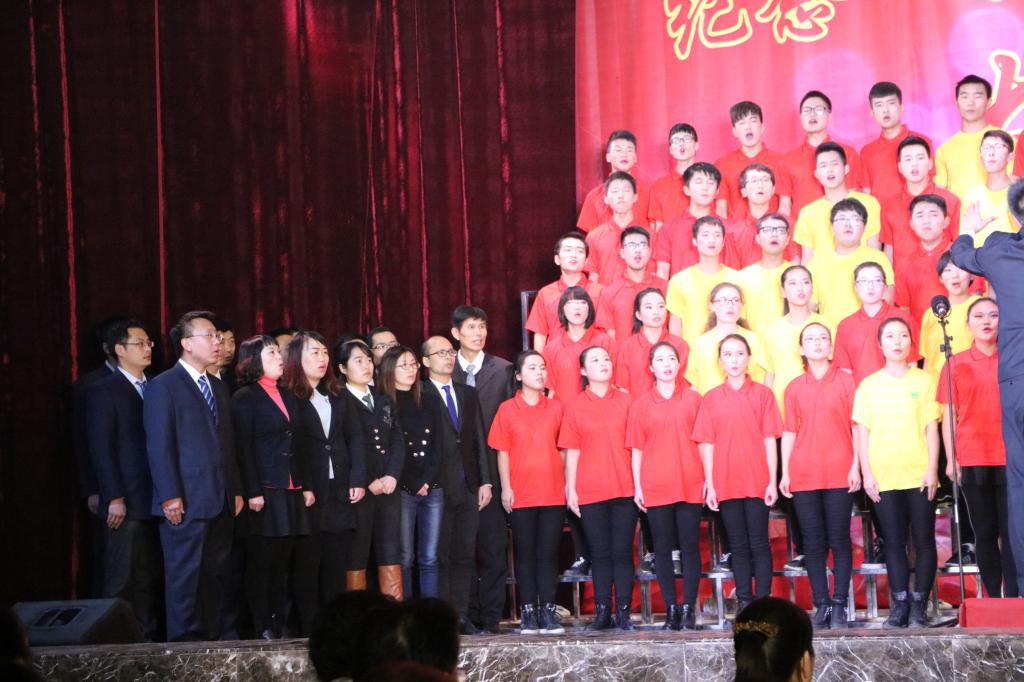beats365vip官网登录入口和继续教育公司共同组成的合唱团首先上台。合唱团方阵里,大部分同学身着红色服装,小部分同学身穿黄色服装,形成五星红旗的图形。合唱团分别演唱了《beats365vip官网登录入口之歌》,和改编自《强军战歌》的《青春战歌》,圆满完成了演唱。在演唱的背后是两周以来,在老师的悉心指导下,同学们一次又一次的发声练习,努力排练。