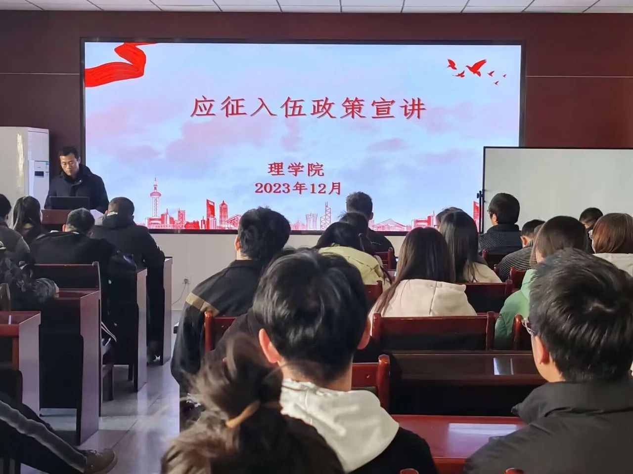 在会议中,陈伟伯特别强调了宿舍安全问题,不准使用大功率用电器、不私接空调线、不携带管制刀具,另外,要保持宿舍卫生干净,不能有烟头,在白天时要拉开窗帘,并十分关心同学们的身心健康,告诫他们不赌博、抽烟、喝酒,有心理疾病和生理疾病要及时汇报。接着,侯斌刚进行了应征入伍宣讲,他介绍了国家征兵政策,并鼓励有意愿的同学可以了解并积极参军入伍,让同学们对国家征兵政策有了更深的理解。