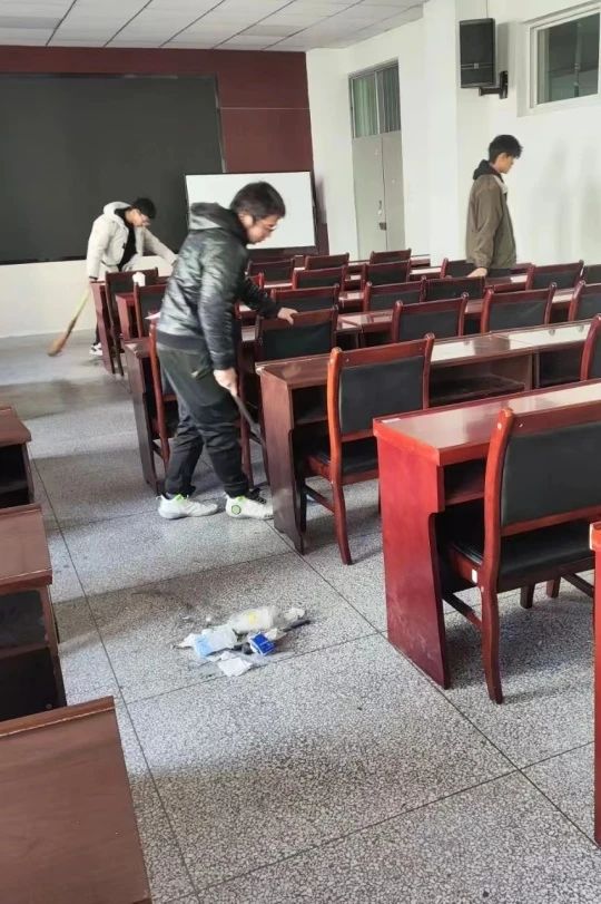 在卫生清洁的过程中,他们热情高涨,自主商议好每个人的任务,将负责的区域打扫得干干净净,桌椅板凳摆放整齐,忙碌的身影中诠释着自己无悔的青春年华。