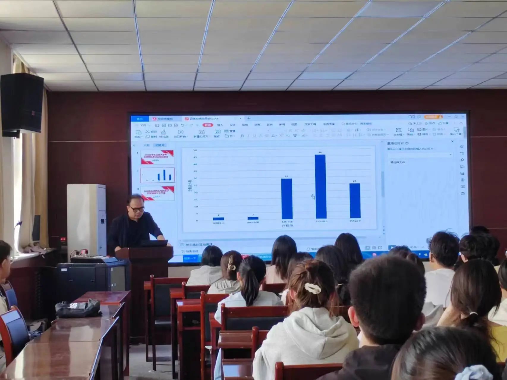 接着,陈伟伯先对各班通过情况进行统计比较,对两位高分同学表示祝贺,接着以考研和就业对英语水平的需要阐述了抓好英语学习的重要性,最后详细讲述了英语四级备考的策略方法。