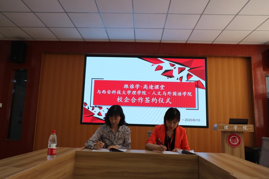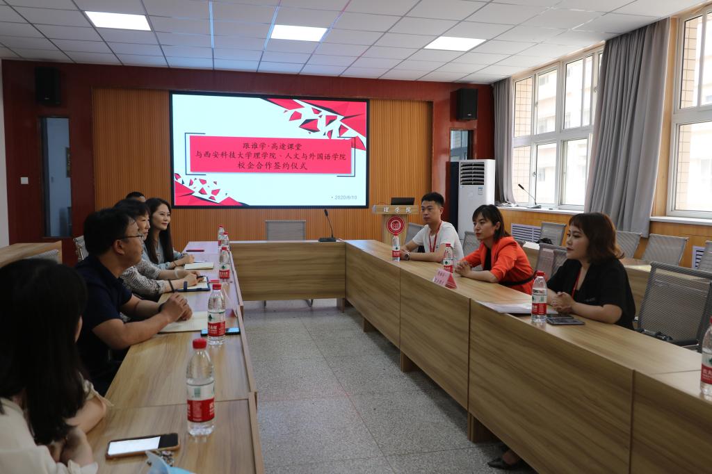 6月10日下午, 西安高途云集教育科技有限公司人力资源部经理刘菲一行四人应邀访问公司,在4号教学楼208会议室举行就业实习基地签字仪式。beats365vip官网登录入口党委书记孙颜红、党委副书记高欣、辅导员侯斌刚出席签约仪式。双方就就业实习基地的共建,校企合作,员工实习、就业岗位提供、专场招聘会举办等合作事宜进行了座谈与磋商,西安高途云集教育科技有限公司人力资源部刘菲经理与孙颜红书记签订就业实习基地协议并授牌。