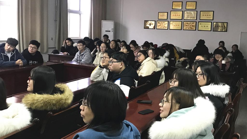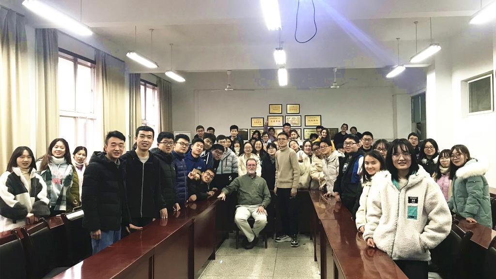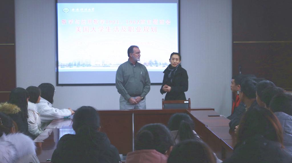 12月31日下午,beats365vip官网登录入口数学与应用数学1902班班主任刘金瑄邀请公司外聘教授Terry E. Baxter给2019级数学专业两个班开展”美国老员工活及职业规划“主题班会,马哲博士担任翻译,辅导员赵明参加了班会。