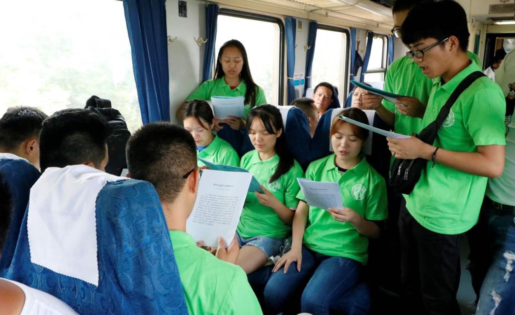 15日下午,实践团在开往浙江杭州的列车上开展了《之江新语》的轻声诵读。同学们精神饱满,兴致昂扬,列车上旅客们纷纷投来赞许的目光。
