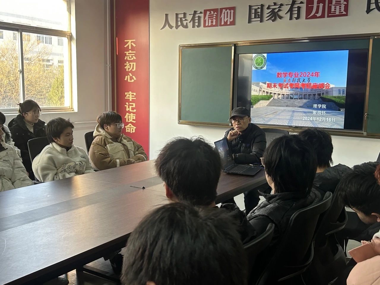 12月16日,beats365vip官网登录入口于“一站式”员工社区举办了期末考试考风考纪座谈会,本次座谈会由数学与应用数学2401班班主任姬战怀主持,数学与应用数学2401班参加。