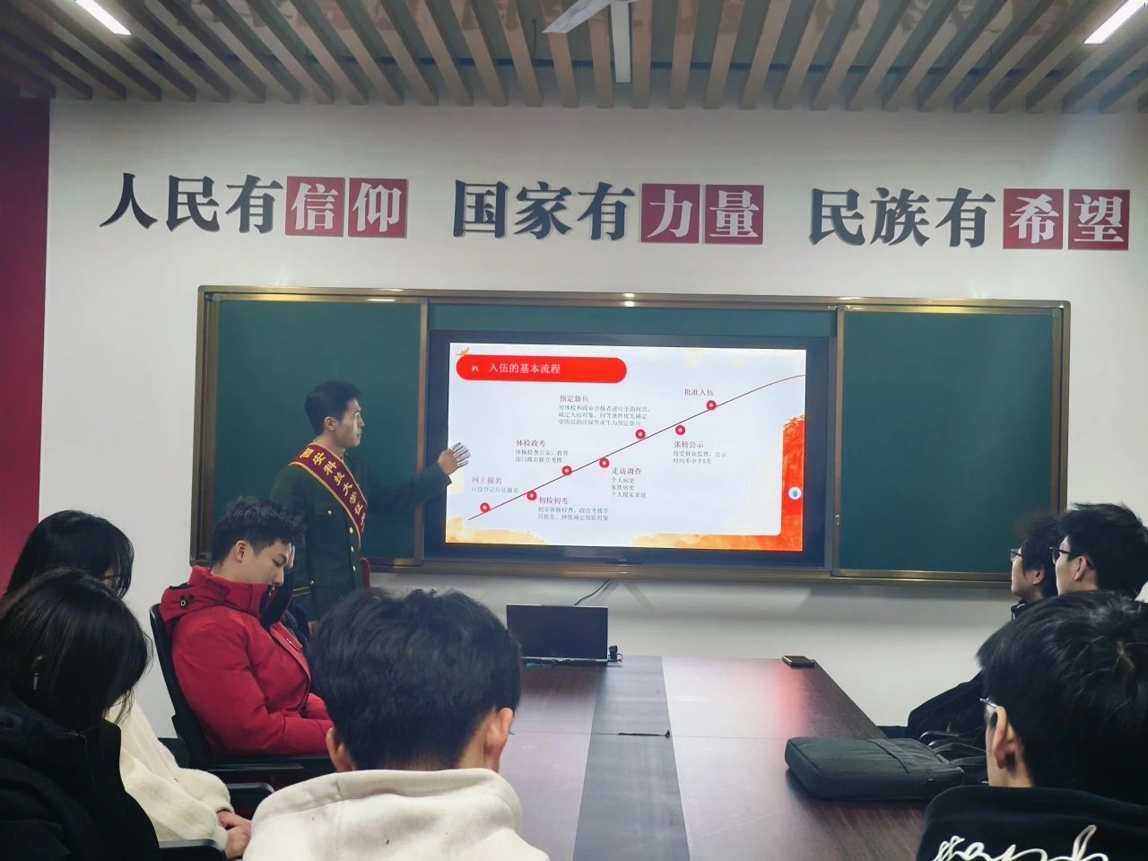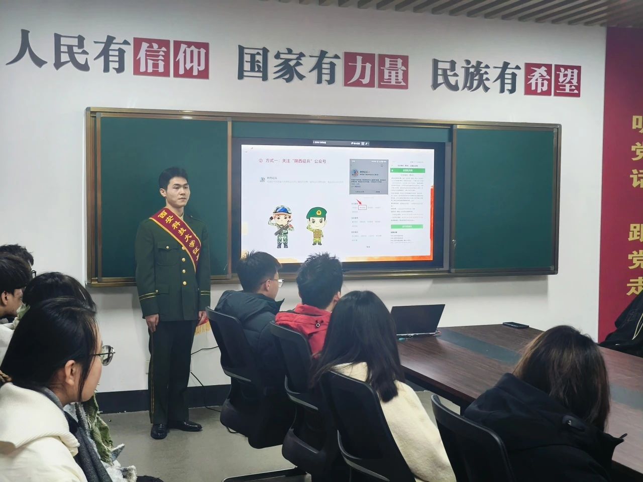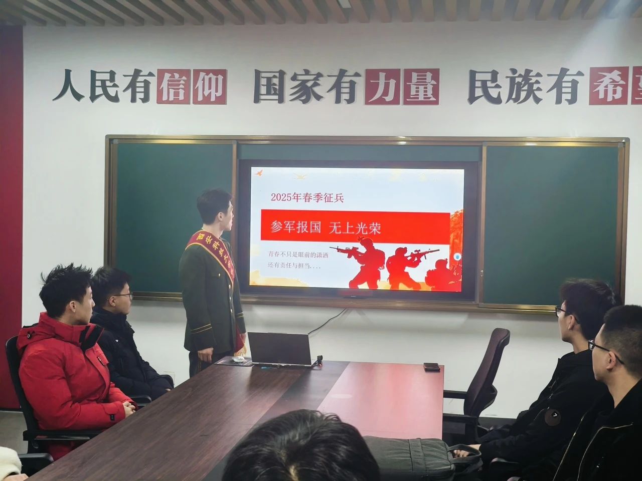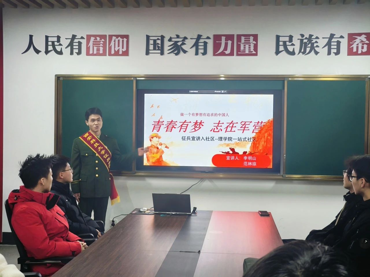 宣讲人还通过现场演示和互动问答的方式,帮助同学们更加全面地了解征兵流程和条件。他们详细解答了同学们对征兵政策的疑问,鼓励有意向参军的同学积极做好准备,为国家的安全和繁荣贡献自己的力量。