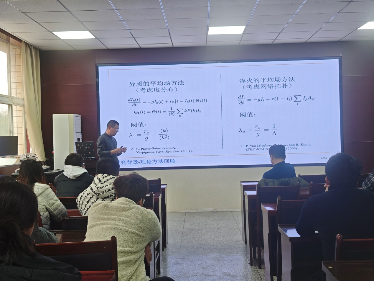 蔡超然教授指出,传统网络流行病学,多基于网络动力学与流行病传播时间尺度分离的极端假设,而现实中二者常处于相似尺度,这对建模与预测提出了新挑战。通过结合蒙特卡罗模拟与平均场理论,研究团队在活动驱动的时变网络模型中发现:链路持久性会降低流行阈值,即恢复速率越高,病毒越易扩散;动态相关性(感染节点邻近效应)则反向推高阈值,形成抵消效应。这两种机制的博弈使得时变网络中的流行病临界行为极为复杂,为防控策略的设计提供了新的理论依据。该研究不仅深化了对复杂网络传播动力学的理解,也为公共卫生领域的流行病建模与预测开辟了新思路。报告结束后,现场师生就模型的实际应用、数据验证方法等问题展开热烈讨论,学术氛围浓厚。