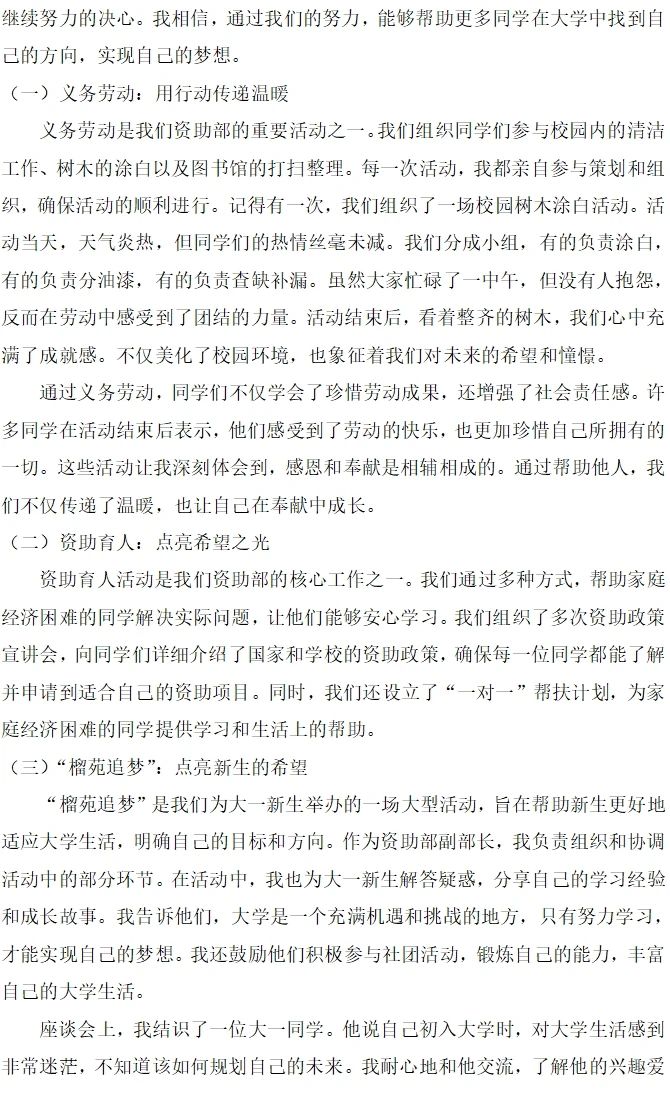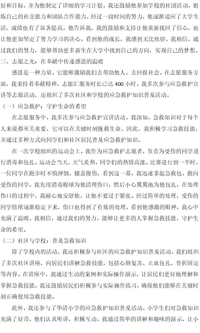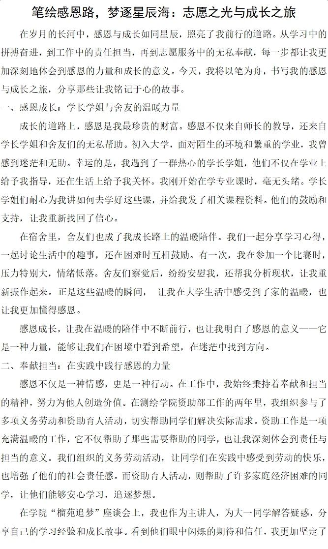参赛同学以真挚的情感和细腻的笔触,讲述了自己的成长故事,抒发了对国家资助政策的感激之情,或以个人经历为线索,展现了从困境中崛起、自强不息的奋斗历程;或以感恩之心为墨,描绘了回馈社会、传递爱心的美好愿景。这些作品不仅语言优美、结构严谨,更在字里行间流露出作者对生活的热爱、对梦想的追求,以及对国家和社会的深深感激。有的以诗歌的形式抒发情怀,有的以散文的笔触记录成长,都充分展示了同学们的文学才华和感恩之心。