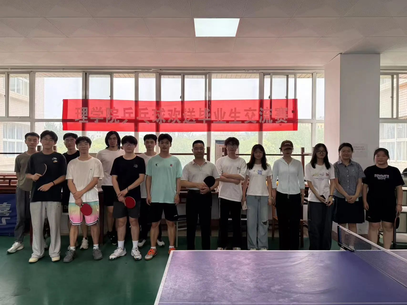 本次比赛设置男单、女单、混双等多元项目,吸引20余名师生报名参与。赛场上,毕业生凭借扎实球技频频施展扣杀、旋转球等技巧,展现出沉稳从容的 “老将” 风范;在校生则以敏捷反应和旺盛斗志积极应战,飞身救球、极限反拉等精彩瞬间点燃全场气氛。最令人瞩目的师生混双环节中,陈伟伯与毕业生代表组成 “跨界组合”,与在校生联队展开激烈对决。双方默契配合、攻防转换间,既有战术博弈的紧张感,也有师生互动的温情瞬间,精彩场面赢得观众席阵阵喝彩。