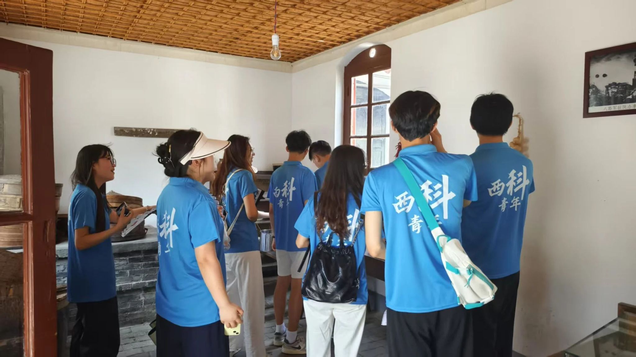 活动中,同学们依次参观了旧址内的办公室、会议室、宿舍、厨房等复原场景,仔细聆听了关于周恩来、朱德、刘少奇等老一辈无产阶级革命家在此工作和生活的感人故事。泛黄的文件、锈迹斑斑的武器、简陋的生活用品,每一件文物都承载着厚重的历史记忆,生动展现了革命先辈们在艰苦环境中坚守信仰、无私奉献的崇高精神。同学们不时驻足凝视这些珍贵文物,彼此轻声交流感悟。 大家沉浸在对革命历史的追思中,深切领悟到先辈们为国家独立、民族解放所付出的巨大牺牲与不懈努力。