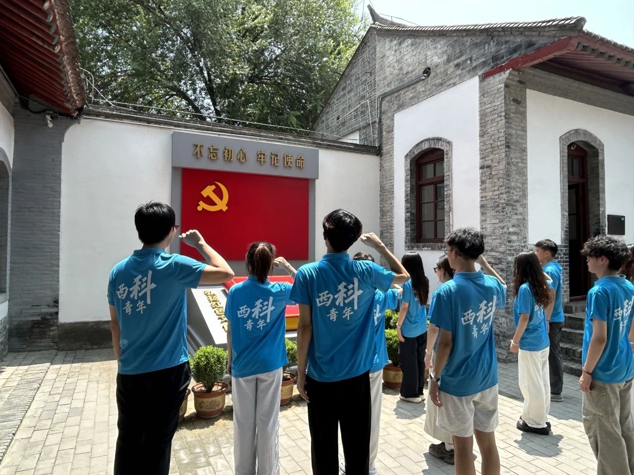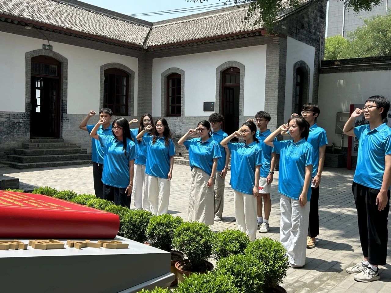 参观结束后,阳光透过纪念馆的雕花窗棂,在青灰色的砖墙上洒下斑驳光影。在鲜红的党旗下,同学们整齐列队,神情庄重,举起右拳,由应用统计2401班董妍领誓,庄严宣读入党誓词。“我志愿加入中国共产党,拥护党的纲领,遵守党的章程,履行党员义务,执行党的决定,严守党的纪律,保守党的秘密,对党忠诚,积极工作,为共产主义奋斗终身,随时准备为党和人民牺牲一切,永不叛党。”铿锵有力的誓言回荡在纪念馆内,不仅是对革命先辈的深切缅怀,更是对初心使命的坚定重申,让在场的每一位同学都受到了一次深刻的党性教育和精神洗礼。