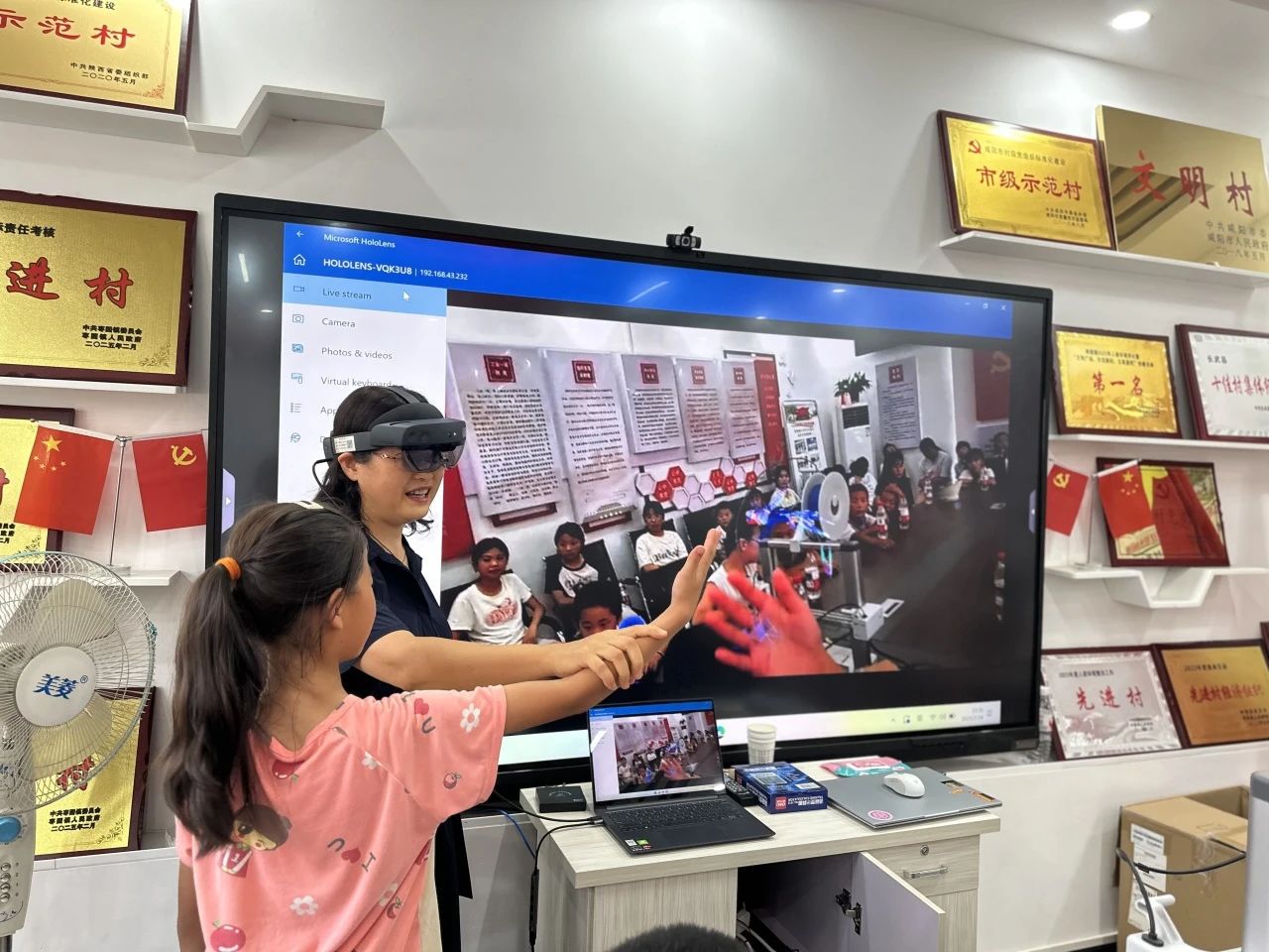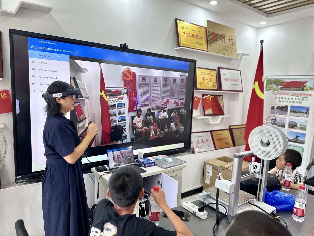 刘佳老师进行MR技术讲解及现场展示。孩子们戴上MR设备,瞬间 “穿越” 到奇幻的虚拟世界,与虚拟物体互动嬉戏,沉浸式的体验让孩子们欢呼雀跃,眼中闪烁着对未知世界的向往。