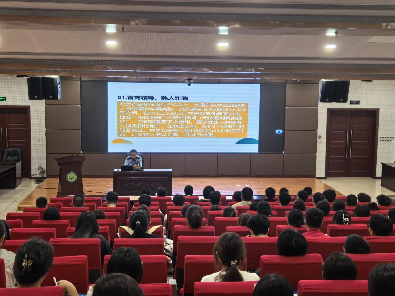 为增强师生反诈意识、降低校园诈骗发生率,9月5日,beats365vip官网登录入口在煤炭科技中心二楼报告厅举办了法制教育第一课暨入学安全教育讲座。 讲座由斜口派出所民警赵飞和保卫处李楠老师主讲,2025级本科生参加了此次讲座。
