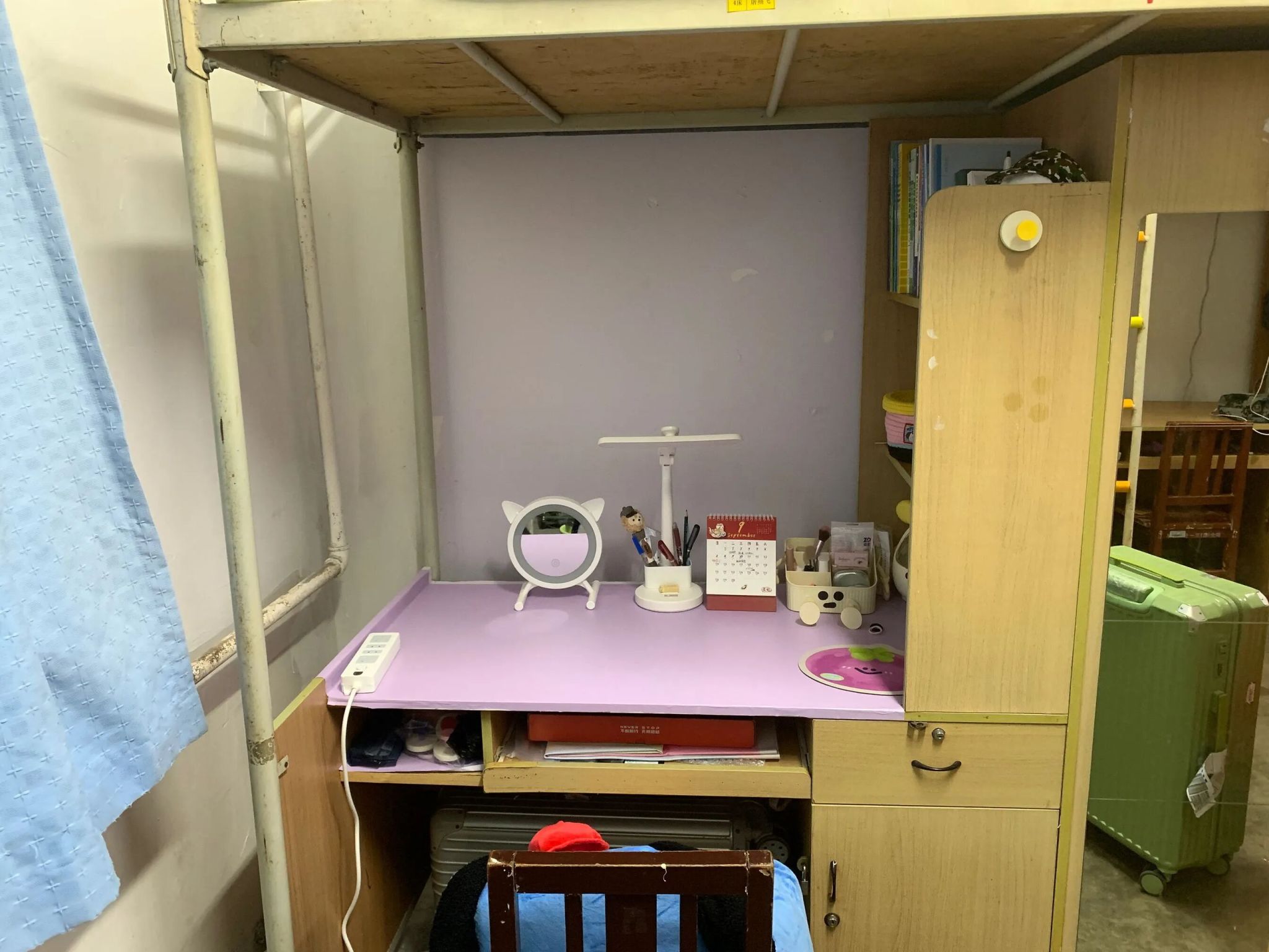 与此同时,“整理书桌”的战役也同步打响。教官对书桌整洁定下了明确标准:书籍需按尺寸大小分类竖立摆放,形成整齐的“书墙”;文具用品归置入笔筒,散乱的数据线用绑带束好,做到桌面无杂物,视野所及皆井然。教官一边指导一边强调,书桌是思想的阵地,一个整洁有序的环境是高效学习的基础,这份条理本身就是一种自律。