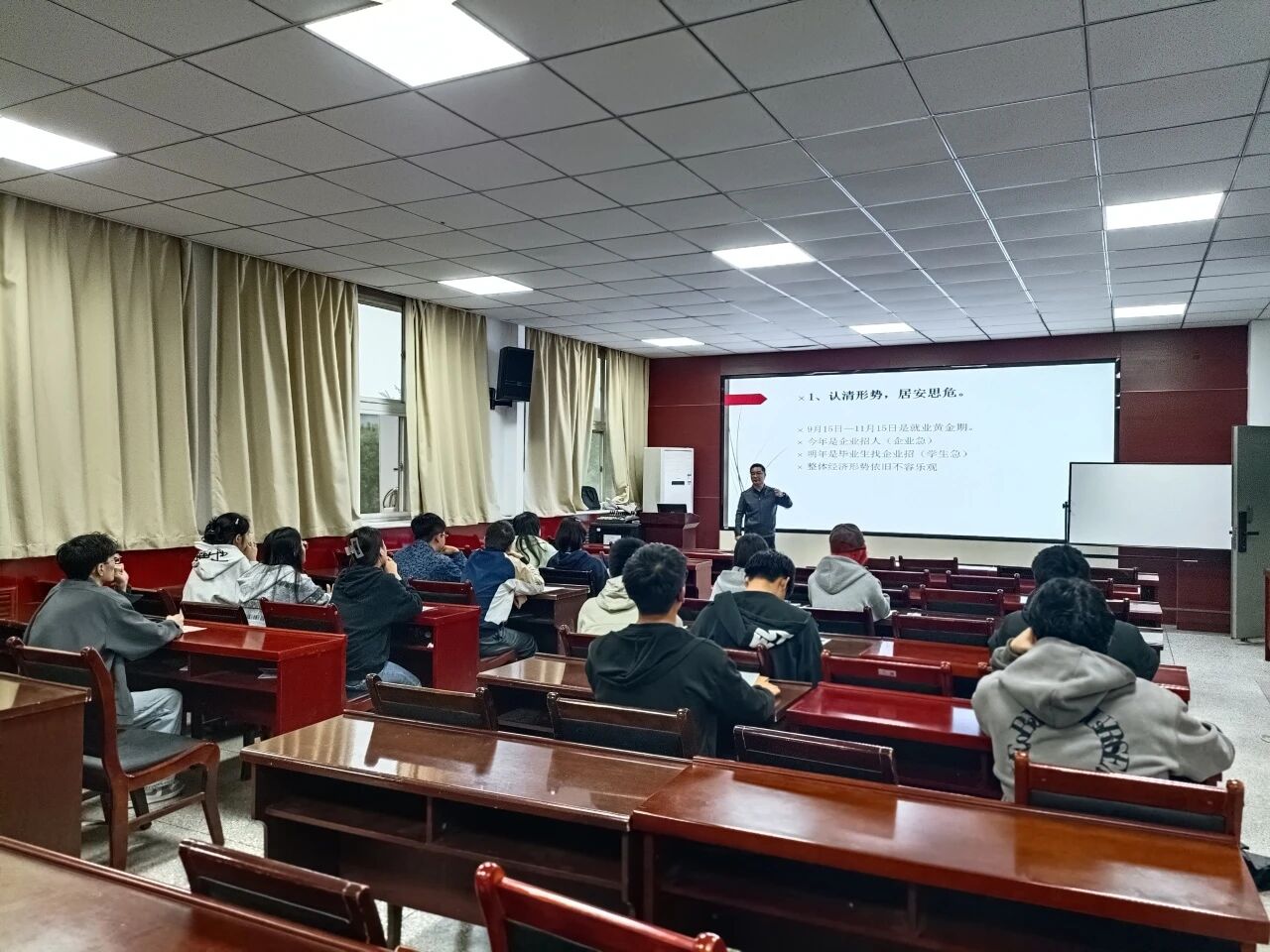 侯斌刚随后进行了具体补充。他结合往届员工的真实案例,在简历优化、面试常见问题应对、招聘信息高效获取等实操层面提供了更具象的指导。他表示,将随时为同学们提供个性化的咨询与帮助,做大家冲刺路上最可靠的陪伴者与支持者。