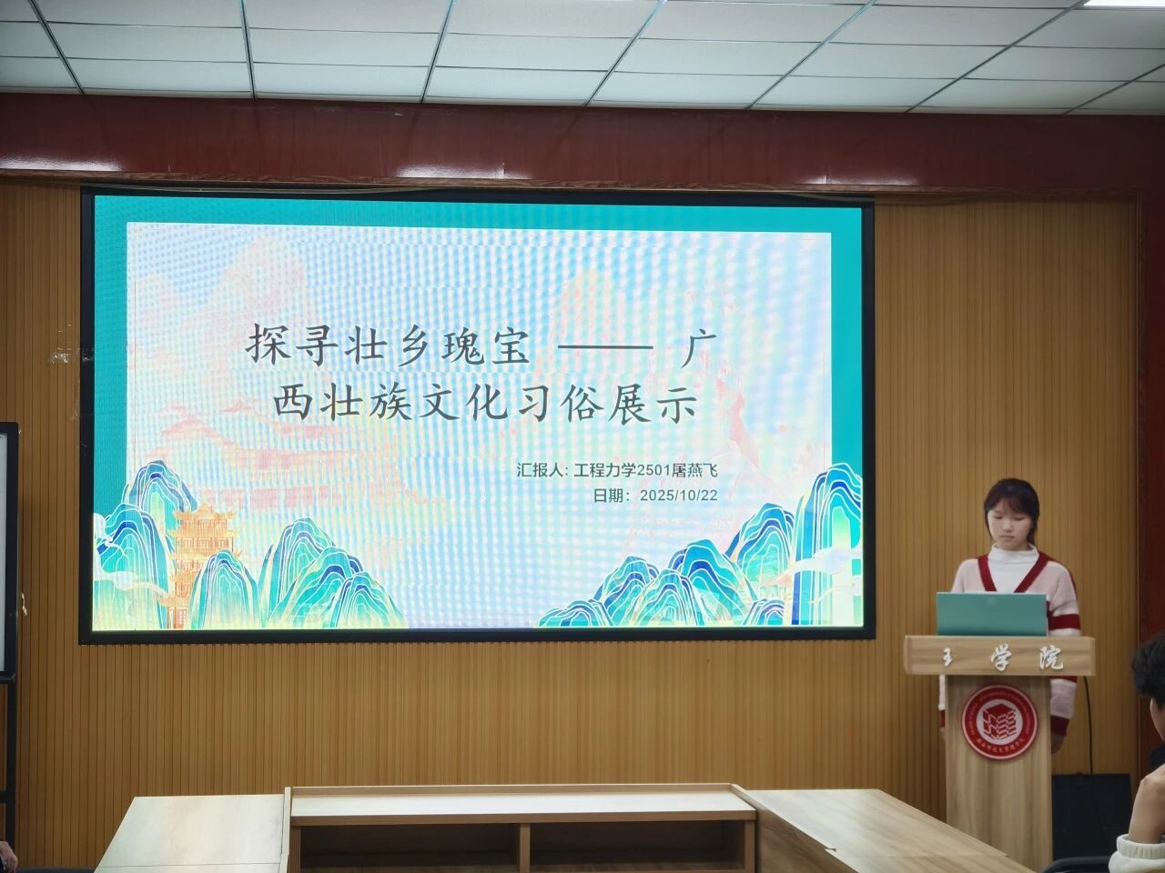 工程力学2501班屠燕飞与廖辉雄向大家介绍了壮族文化。从壮族悠久的历史、动听的山歌,讲到寓意深远的“三月三”歌圩和特色美食,充分展现了壮族文化的灿烂辉煌。他们的分享再次印证了中华文化 “各美其美,美美与共” 的和谐格局。