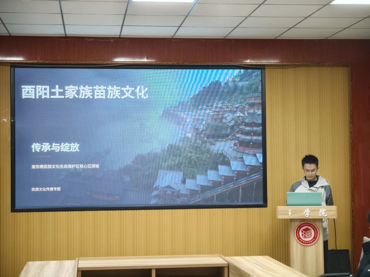 工程力学2501班石闽俊带来了酉阳土家族苗族文化的介绍。他从摆手舞、傩戏等非物质文化遗产入手,生动描绘了当地浓郁的民族风情。他的讲述让同学们深刻体会到,正是这些各具特色的民族文化,共同构成了中华文明的博大精深。