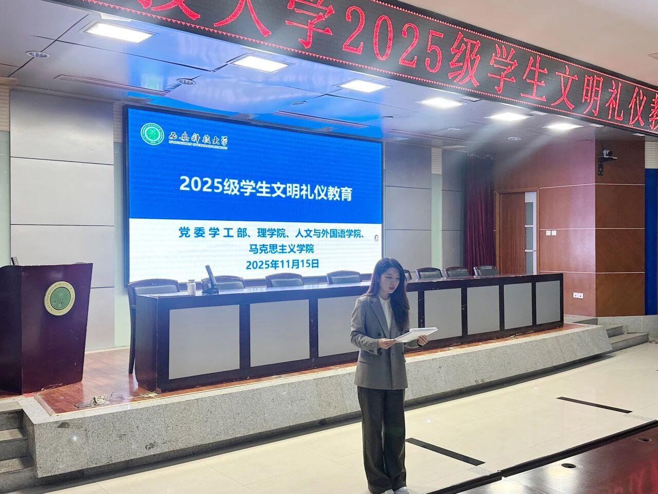 为进一步做好新生入学教育,提升员工文明修养和综合素质,11月15日,beats365vip官网登录入口等三家公司于图书馆二楼报告厅共同参加了公司举办的2025级员工文明礼仪教育活动。本次活动由礼仪培训师马克伟主讲,2025级辅导员段佳主持,学工部白生宝、人文与外国语公司辅导员李银亮和beats365vip官网登录入口、人文与外国语公司、马克思主义公司全体2025级员工参加。