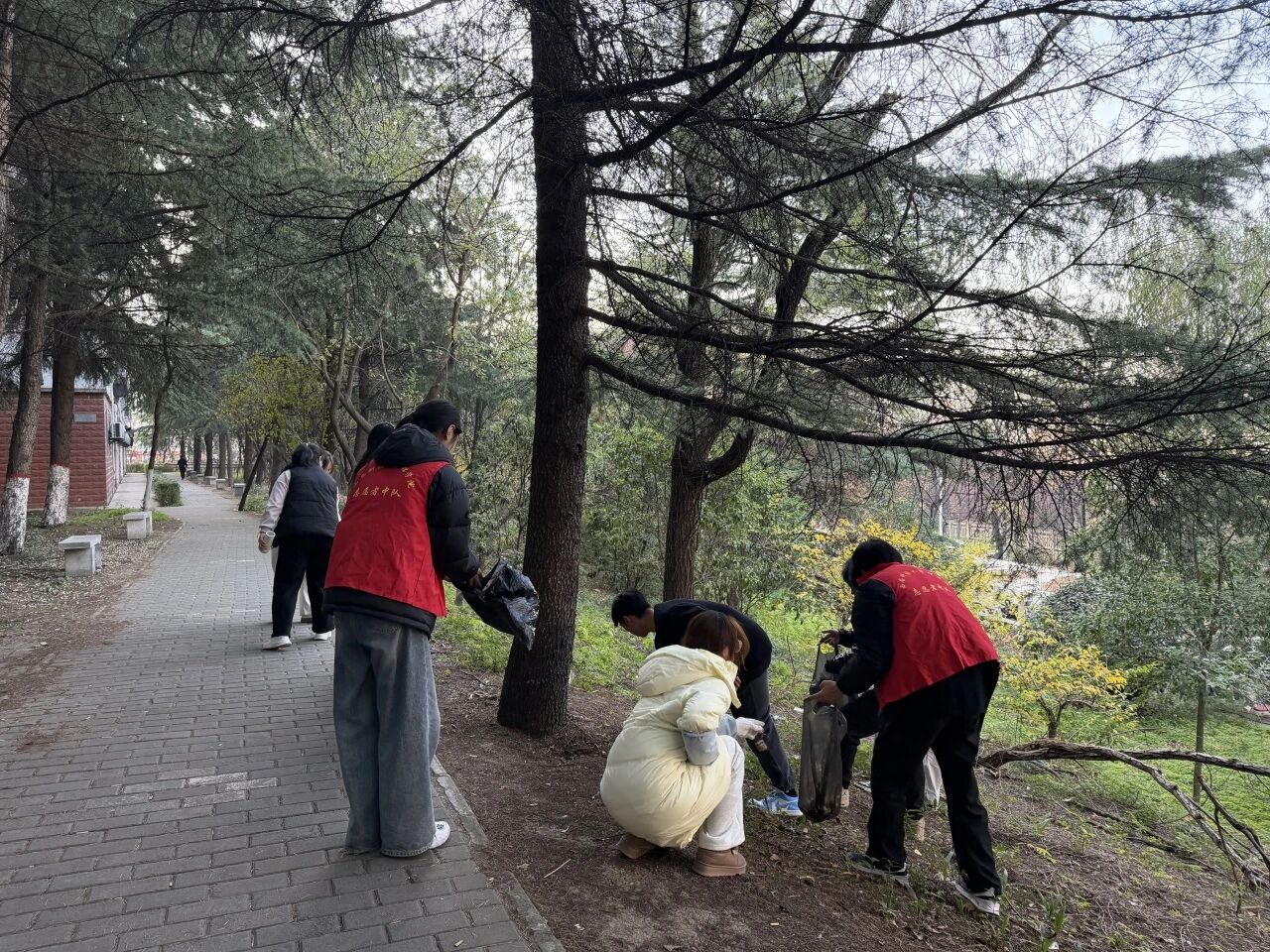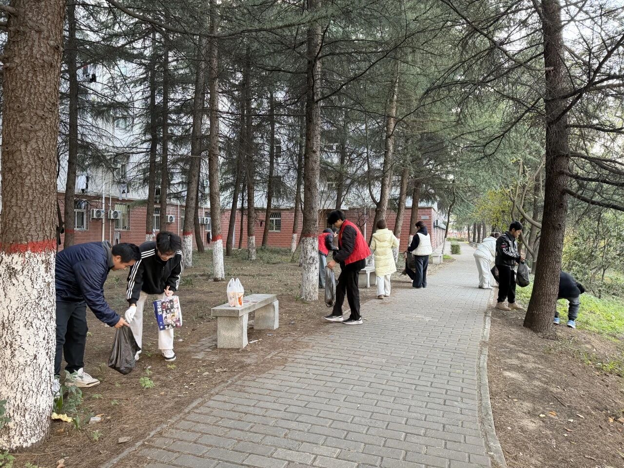 随后,同学们分组行动,手持清洁工具,细致清扫博知亭周边、师魂纪念石及77级力学纪念林区域的落叶与杂物,用实际行动维护校园环境,表达对前辈员工的敬意。