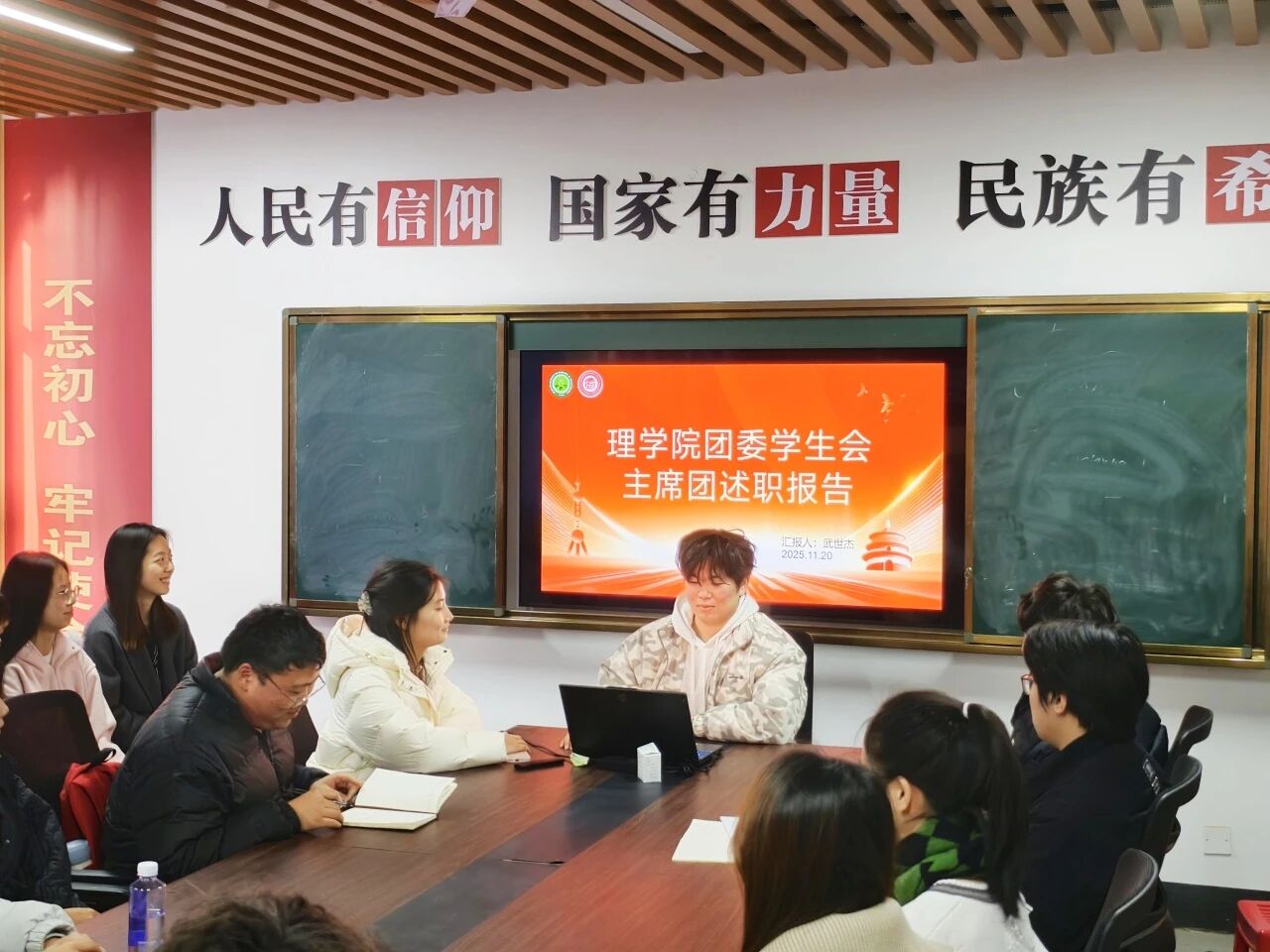 主席团成员姚如畅首先进行述职。他围绕学期整体工作规划、思想引领活动开展及内部协调机制建设等方面进行了系统汇报。他表示,员工会始终以服务同学为根本宗旨,本学期通过优化工作流程,确保了各项活动有序推进,未来将继续着力于凝聚组织合力,夯实工作基础。