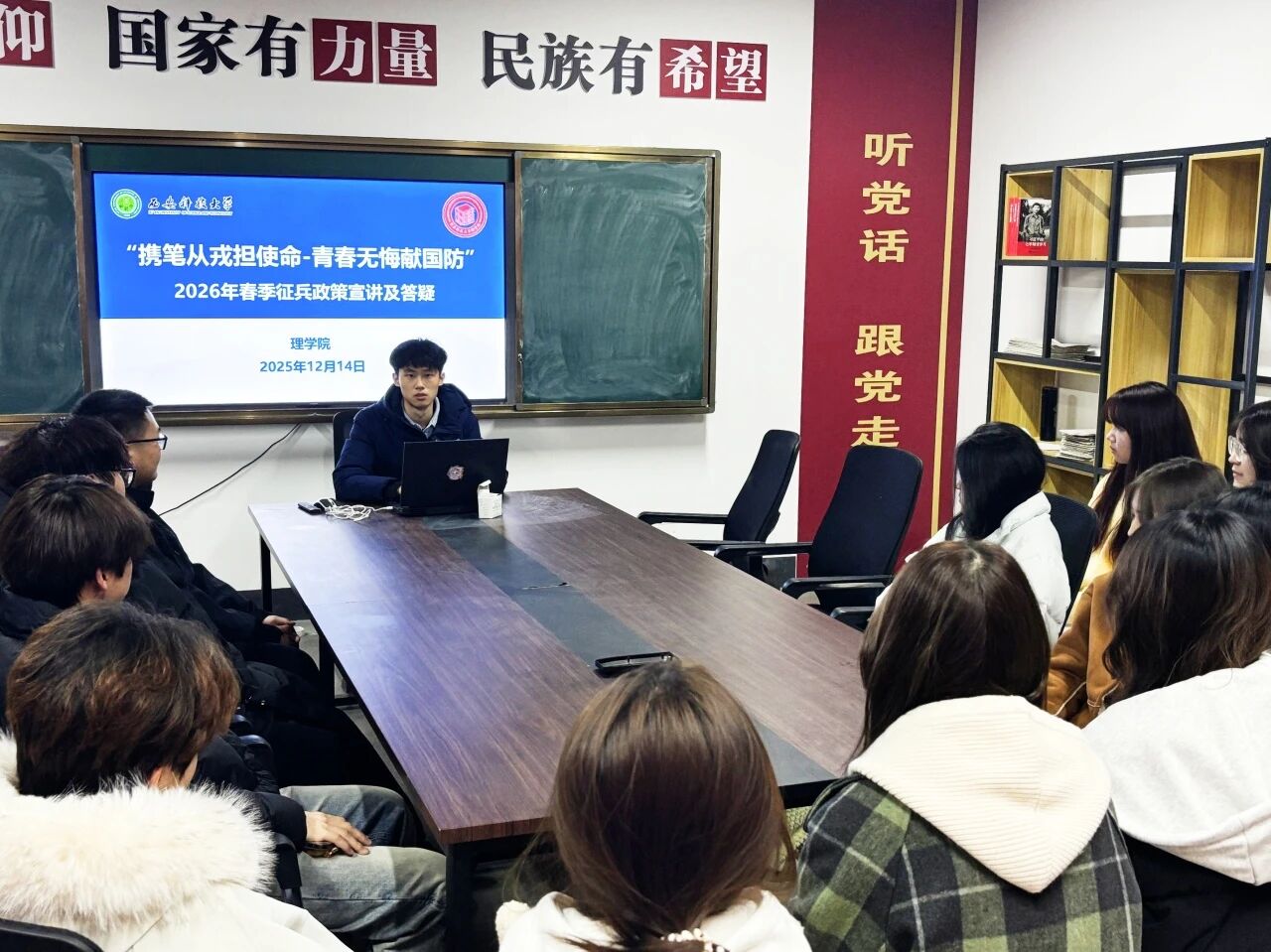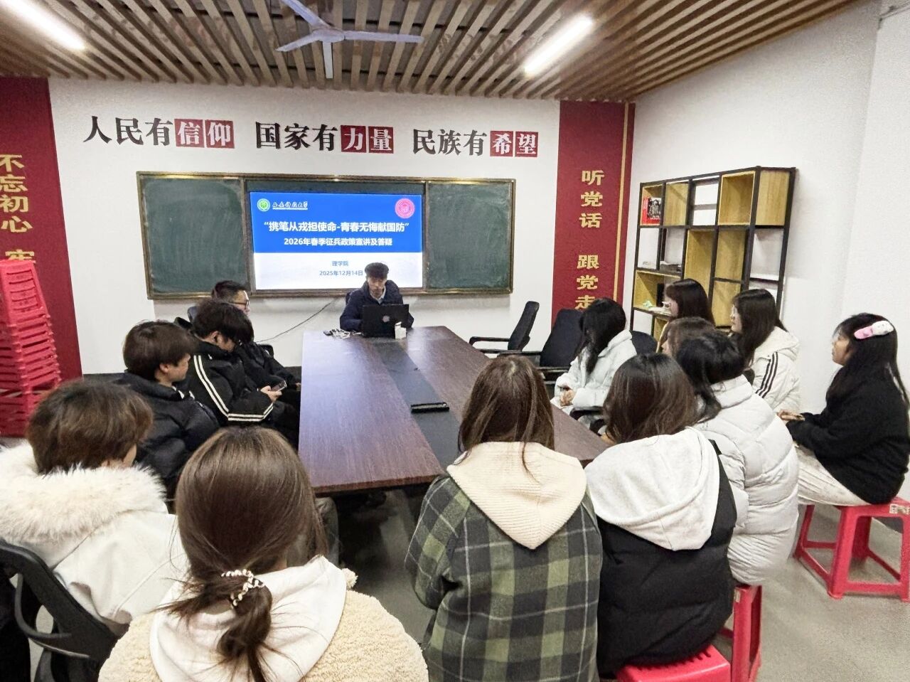 为积极响应国家征兵号召,鼓励青年学子投身国防事业,12月14日,beats365vip官网登录入口于“一站式”员工社区举行了2026年春季征兵政策宣讲及现场答疑活动。本次活动由院团委员工会办公室部长古致铮主持,面向2025级部分本科生进行政策解读与动员。