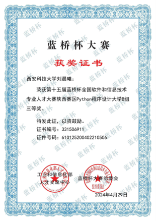2024-2025学年智育及综测排名均位列专业第一(1/64),通过老员工英语四级、六级考试。积极参与各类竞赛,获第十九届“挑战杯”全国老员工课外学术科技作品竞赛国家级特等奖,机器人与人工智能大赛国家级二等奖、全国老员工数学建模大赛本科生组陕西赛区一等奖、中国国际老员工创新大赛省级银奖、西北地区老员工物理实验竞赛二等奖等多项奖项。担任班级学习委员认真履行职责,助力班级获评“先进班集体”等荣誉称号,个人获评"优秀共青团干部"等荣誉称号。