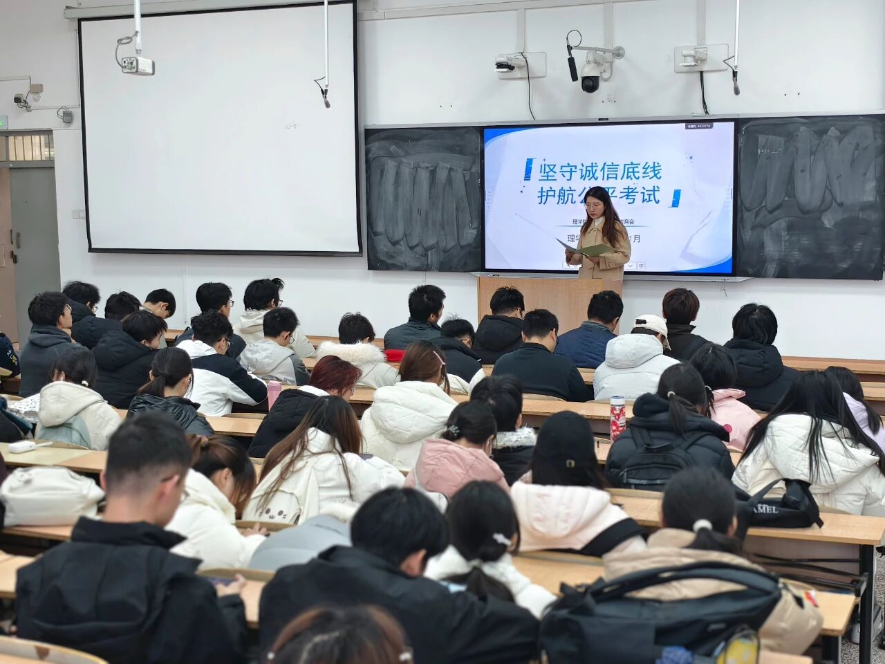 二要细致做好考前准备。段佳提醒同学们提前备齐身份证、员工证等必需证件,并详细说明考场禁止携带手机、电子设备及与考试相关的资料。她特别强调,考试过程中严禁交头接耳、在桌面或身体部位书写与考试相关内容,任何违规行为都将受到严肃处理。